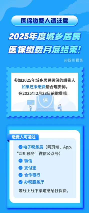 保子们注意啦 Mr.YB温馨提示 成都市2025年度城乡居民医保 集中筹资期将于本月底截止 只剩下最后十几天 请大家合理安排缴费时间 避免错过集中筹资期 影响2025年医保待遇 还有保子在后台咨询 手机上怎么缴费? 缴费时 如果显示没有参保信息 那么一定要先办理参保登记 再缴费! 参保登记渠道 (一)线上登记 成年居民和18岁以下散居儿童(含新生婴儿),可通过“国家医保服务平台”APP、“四川/成都医保公共服务平台”微信小程序、“成都医保”微信公众号,办理城乡居民参保登记。 (二)线下登记 1.在册在校学生、在园幼儿。在学校或幼儿园登记。 2.成年居民和18岁以下散居儿童(含新生婴儿)。在户籍所在地医保经办机构、街道(乡镇)或村(社区)医保服务点登记。 3.政府资助参保对象。由相应资助部门进行参保登记。 办理参保登记,需要以下资料: 1.本市户籍城乡居民应提供:身份证件。 2.非本市户籍成年居民应提供:身份证件、本市公安部门颁发的居住证。 3.非本市户籍未满18周岁的散居儿童(含新生婴儿)应提供:父母任意一方的本市身份证件/本市公安部门颁发的居住证/港澳台居民居住证、参保人身份证件等相关资料。 4.港澳台人员应提供:港澳台居民居住证。 5.外籍人员应提供:本市颁发的《外国人永久居留证》,或者非本市颁发的《外国人永久居留证》与《外国人住宿登记表》。所有资料均提供原件及复印件。 续保人员无需重复办理参保登记 直接办理缴费即可 以下是缴费操作指南 ↓↓↓ |
